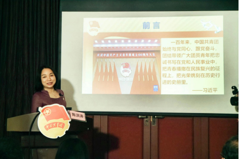 陈洪涛教授以时间为“纬”,以各时代经典歌曲为“经”,生动的讲述了新民主主义革命时期、社会主义革命和建设时期、改革开放和社会主义现代化建设新时期、中国特色社会主义新时代四个时期党领导的中国青年运动光辉历程,激励团干、团员青年们“青春永向党,强国必有我”。各时期穿插《国际歌》《没有共产党就没有新中国》《唱支山歌给党听》《春天的故事》《年轻的朋友来相会》《我们都是追梦人》《一起向未来》等反映各时期青年人所熟知传唱的经典歌曲,让听课的团干、团员青年们激情澎湃、热血沸腾。课程生动、事例详实,配以音符更入人心。不但回顾了百年来共青团坚定不移听党话、跟党走的青春历程,更用歌声表现出共青团在党的领导下团结带领一代又一代中国青年为实现的中华民族伟大复兴的中国梦而全力拼搏的精神风貌。在团歌《光荣啊中国共青团》大合唱和重温入团誓词中,联合主题团日活动圆满完成。