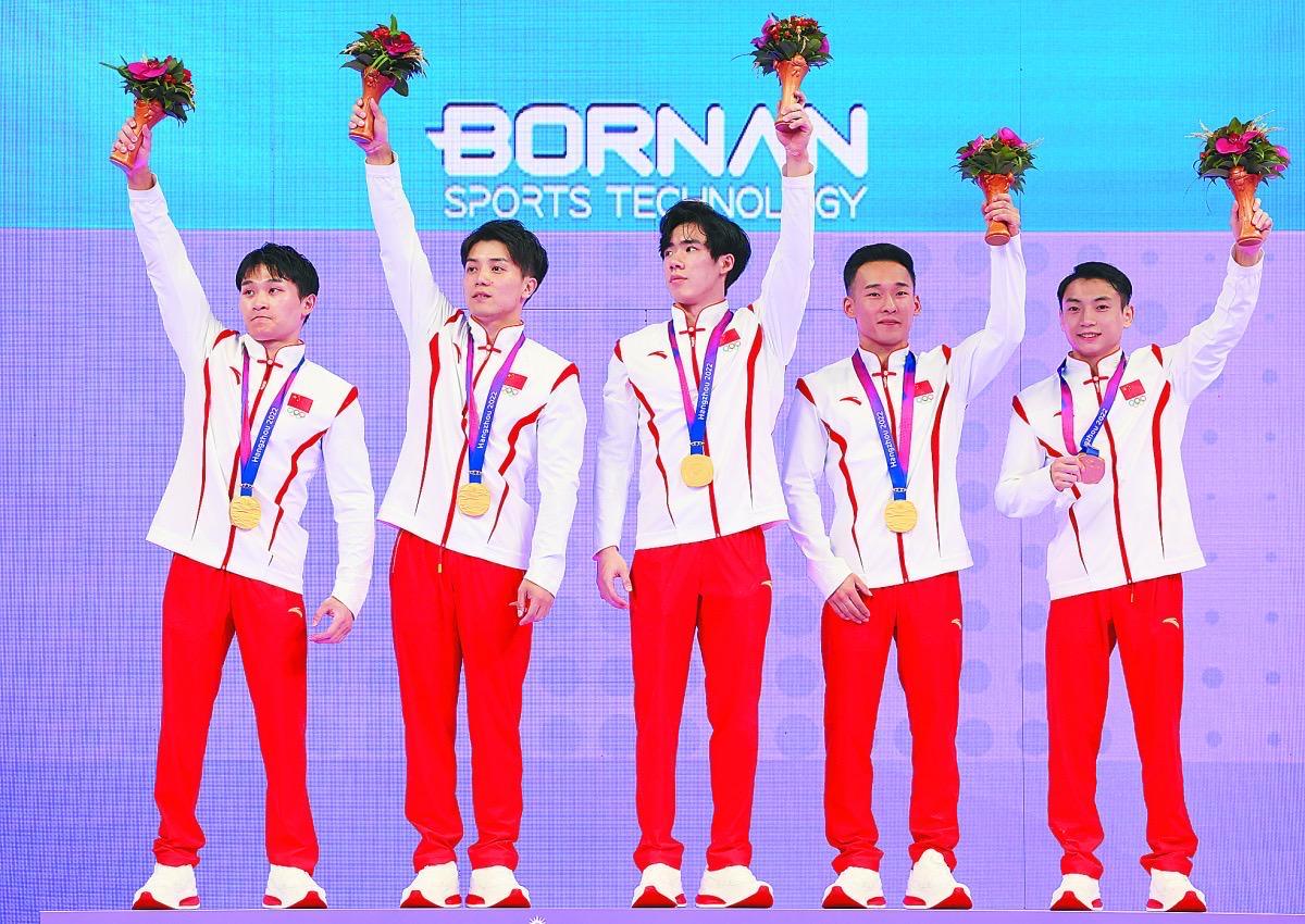 9月24日,杭州亚运会竞技体操男子团体冠军中国队选手兰星宇、林超攀、张博恒、肖若腾、邹敬园(从左至右)在颁奖仪式上。(新华社记者 程婷婷 摄)