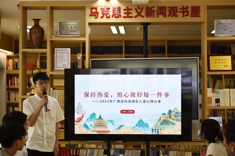 广告191班的冯杰椿即将以定向选调生的身份踏入新征程。选调生的要求之一是任职学生干部时间满1学年以上。冯杰椿曾任新闻与传播学院学生会勤工部部长和传媒实验中心总队长,不断摸索新技术、多次导播晚会,让他在奋斗与奉献中实现了自我价值,为备考选调生积累了经验。