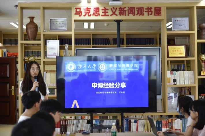 20级专硕的万卉英在读研之初就明确了申博的目标,于是在选导师、发论文、参加学术会议、提高英语成绩等方面,都苦下功夫。万卉英向同学们介绍了申博的流程和需要准备的材料,告诉同学们要在掌握基础学习能力的同时,还要“明确学术研究的方向,以便更好地和博士生导师进行交流”。