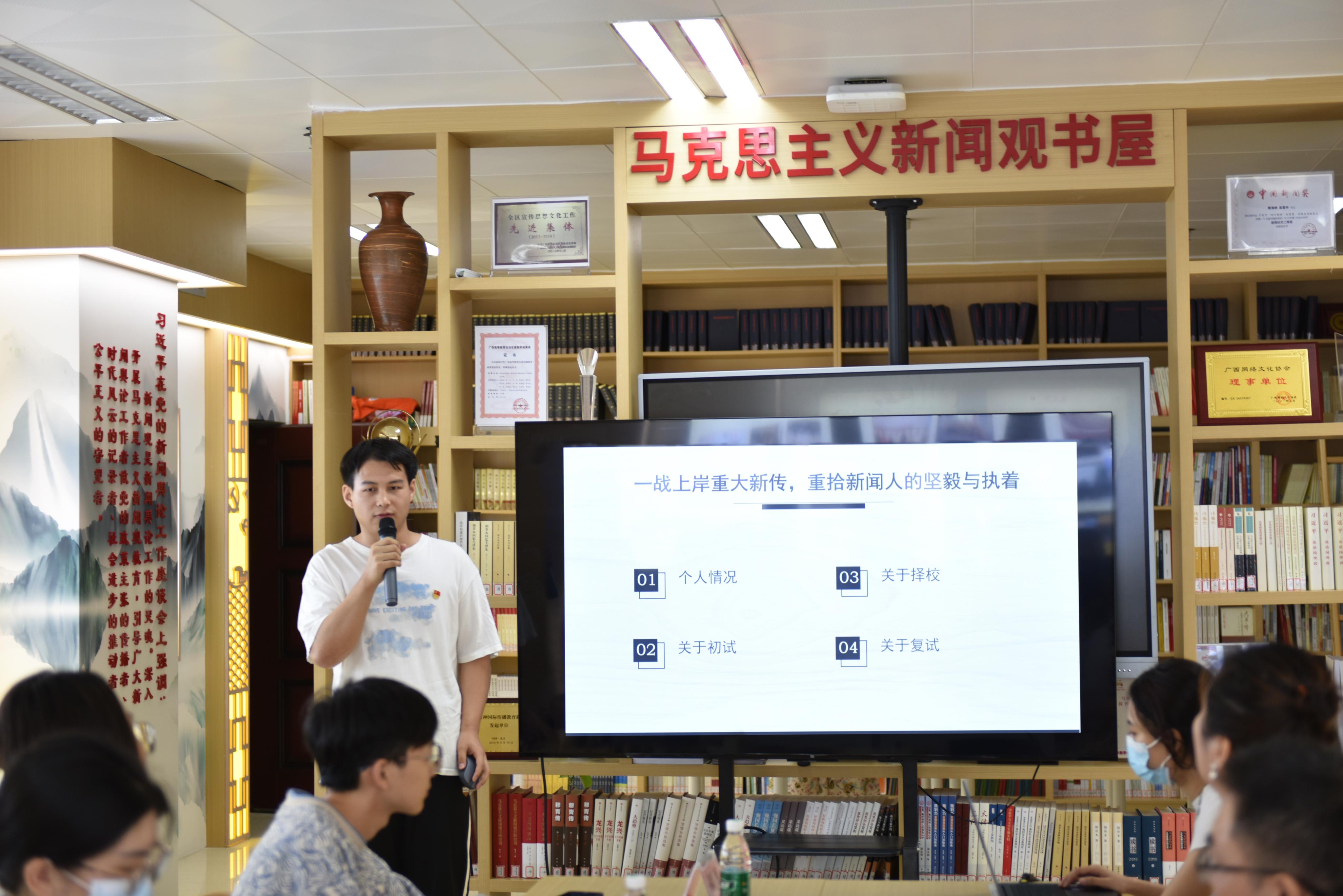 5月24日晚,太阳集团tyc138第79期“青春思享荟”——“循梦而行,我们终将奔赴星辰大海”优秀毕业生经验分享会在新闻与传播学院马新观书屋举行。新闻与传播学院党委副书记银健、团委书记刘梦娟,电气工程学院研究生会主席团成员文育以及新闻与传播学院的学生代表参与活动。来自新闻与传播学院本科及研究生毕业班的6位青春分享人讲述自己的青春故事。