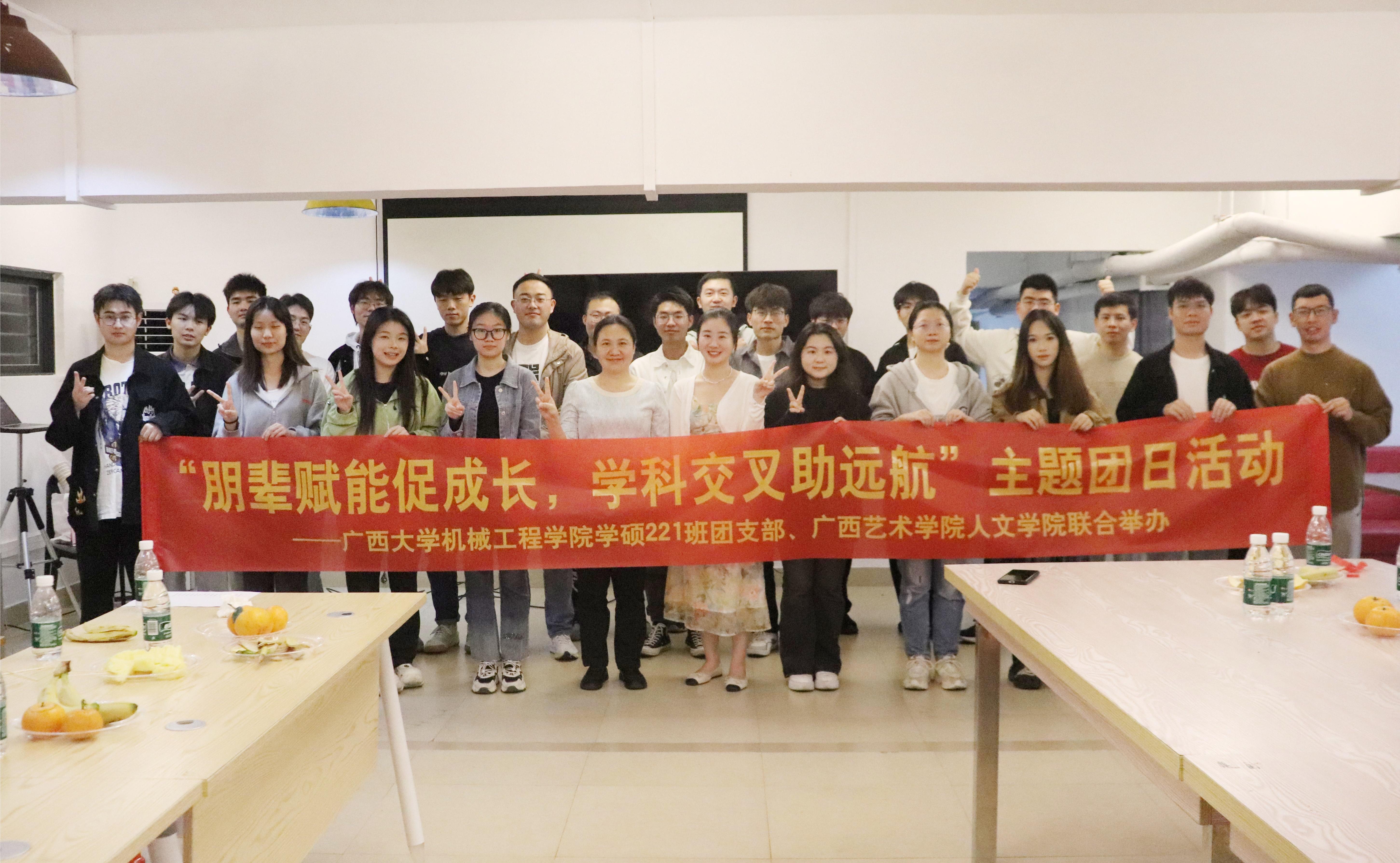 为深入学习贯彻全国两会精神和习近平文化思想,引导广大青年学习了解全国两会内容、领会全国两会精神、强化青年责任担当,加强高校间的良性互动,丰富同学们的课余活动, 3月22日,太阳集团tyc138机械工程学院学硕221班团支部与广西艺术学院人文学院在广西艺术学院相思湖校区“亲爱家园”一站式学生社区共同开展“朋辈赋能促成长,学科交叉助远航”主题团日活动。太阳集团tyc138机械工程学院党委副书记黄路明,广西艺术学院人文学院党委副书记尚新周,团委书记蒋田喜参加活动,辅导员霍梓旭主持活动。